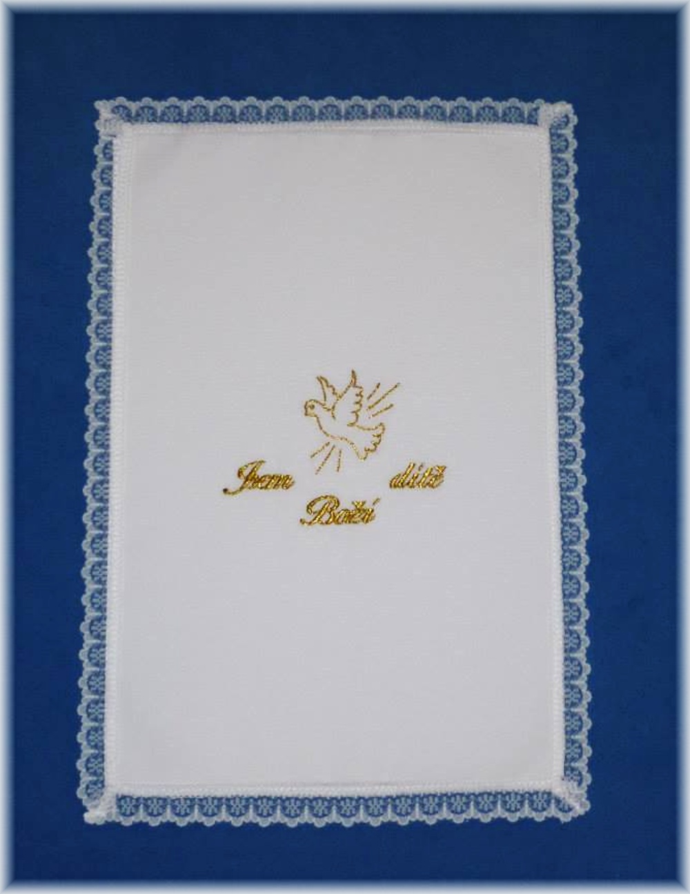 - Křestní rouška s krajkou, výšivka zlatá HOLOUBEK