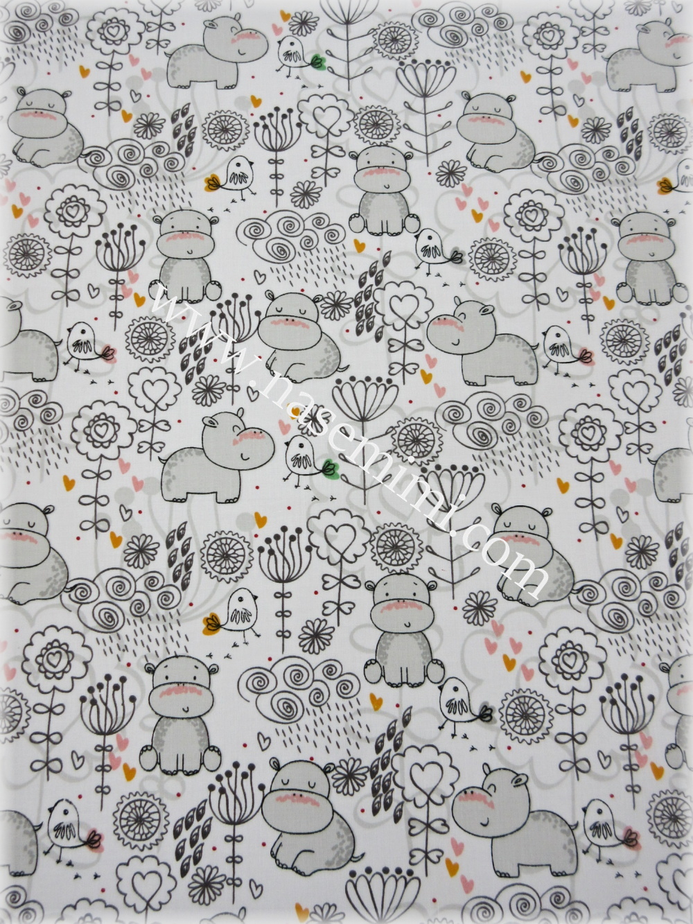 Bavlněná látka plátno s motivem Hroši na bílém podkladě, je vyrobena z kvalitní bavlny, příjemná na dotek.