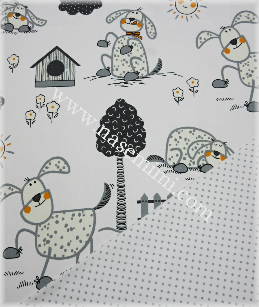 Dvoudílné povlečení do dětské postýlky se vzorem pejsci a šedý puntík na bílém podkladě, je ušité z kvalitní 100 % bavlny.
