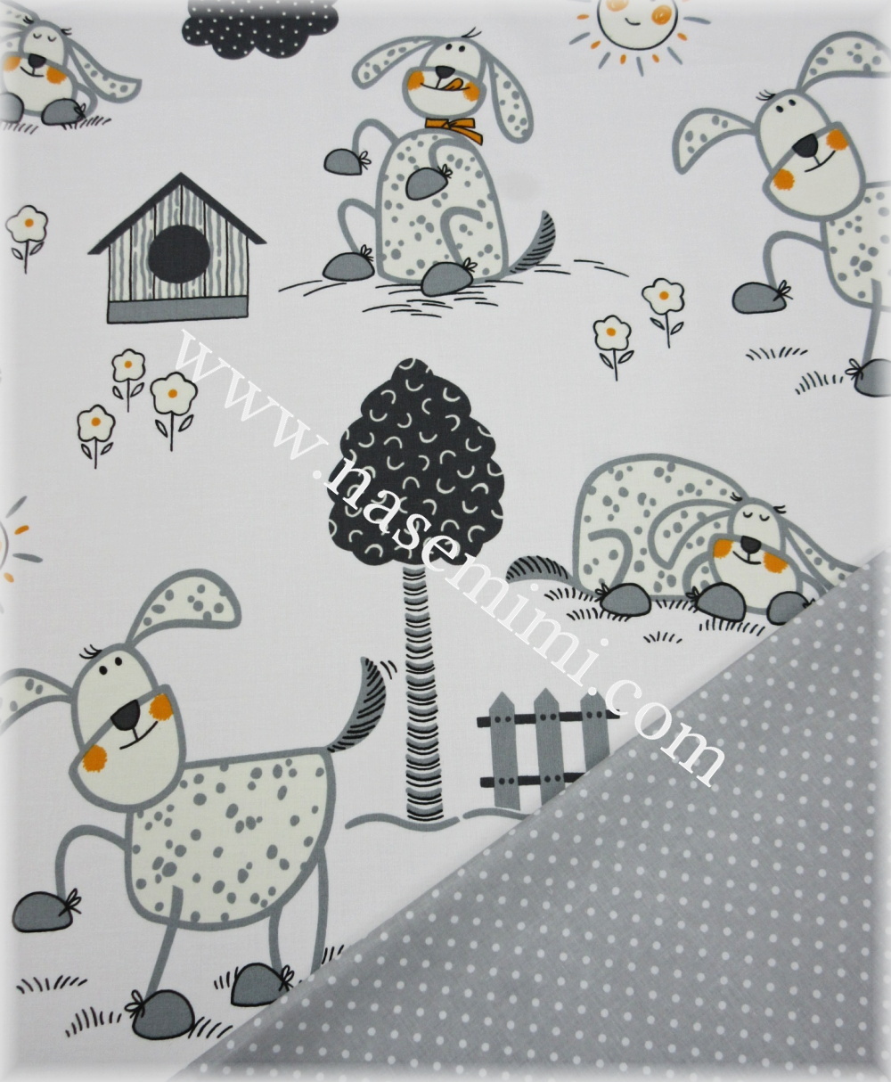 Dvoudílné povlečení do dětské postýlky se vzorem pejsci a bílý puntík na šedém podkladě, je ušité z kvalitní 100 % bavlny.