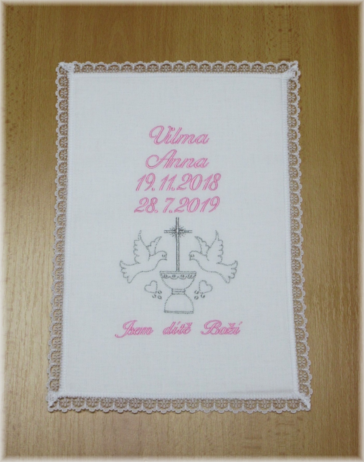 Vyšívaná křestní rouška s krajkou - jména a data dle Vašeho zadání.